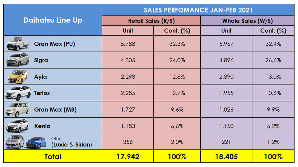 Pada penjualan ritel hingga Februari 2021, penjualan Daihatsu didominasi oleh 3 model utama, yaitu Gran Max Pick-Up 5.788 unit, atau berkontribusi sebesar 32,3%; disusul Sigra 4.305 (24%); dan Ayla sebanyak 2.298 unit (12,8%).
